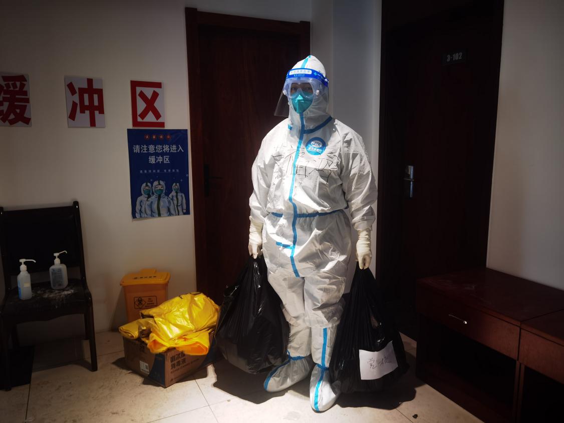 在進駐封閉區的這段日子里,他服務的是一個“特殊”的群體——進行健康監測的出艙學生。從這一刻起,他化身“家政服務生”為同學們提供送餐、垃圾清運、生活必需品傳遞等工作,每天穿脫防護服多次、徒步上下5層樓多次。從早上5點核酸檢測開始直至深夜,為同學們提供熱菜熱飯、急需的生活用品等,他在厚厚的防護服包裹下疾步行走,每每都是汗水打濕了全身、大口大口吸著空氣。每當結束一次次的工作,脫下防護服的那一刻,盡管筋疲力竭、衣裳盡濕但收獲的是滿滿的自豪和滿足,覺得所有的辛苦都是值得的。在這次戰“疫”中,他沒有旁觀,勇于擔當,用付出和真心譜寫著抗疫的華章。