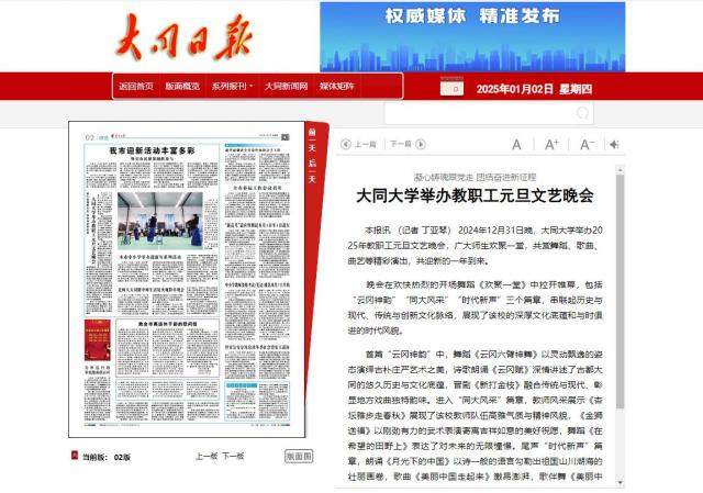 本報訊(記者 丁亞琴)2024年12月31日晚,大同大學舉辦2025年教職工元旦文藝晚會,廣大師生歡聚一堂,共賞舞蹈、歌曲、曲藝等精彩演出,共迎新的一年到來。