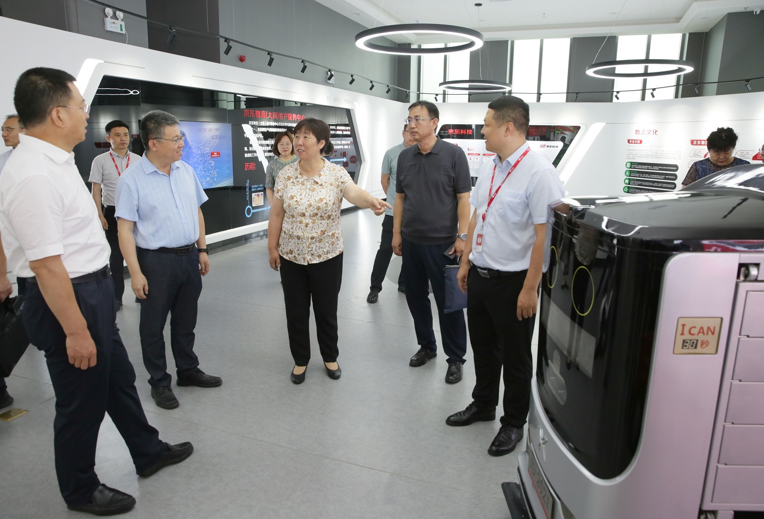 姚麗英一行首先來到京東物流客服中心,參觀了京東科技集團下屬各版塊的工作場景,京東科技集團負責人介紹了京東在大同市的發展歷程和未來規劃,同時也表達了與我校進行深入合作的強烈意愿。大同市政府副秘書長、數字政府服務中心主任韓杰參加調研。