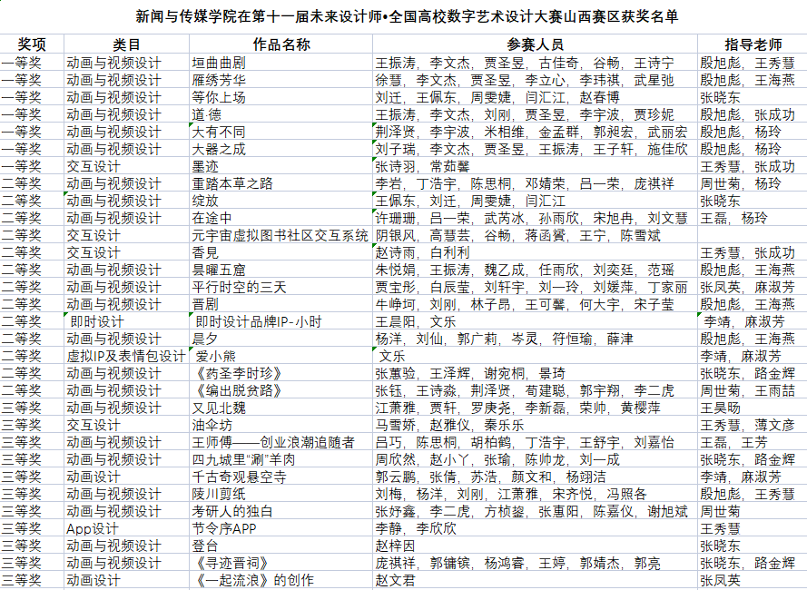近日,第十一屆未來設計師?全國高校數字藝術設計大賽(NCDA)山西賽區成績公布。我校新聞與傳媒學院選送的參賽作品榮獲省級一等獎7項,二等獎13項,三等獎11項,我校參賽作品的獲獎層次和數量在全省排在前列。新聞與傳媒學院共計有20部作品入圍國賽。