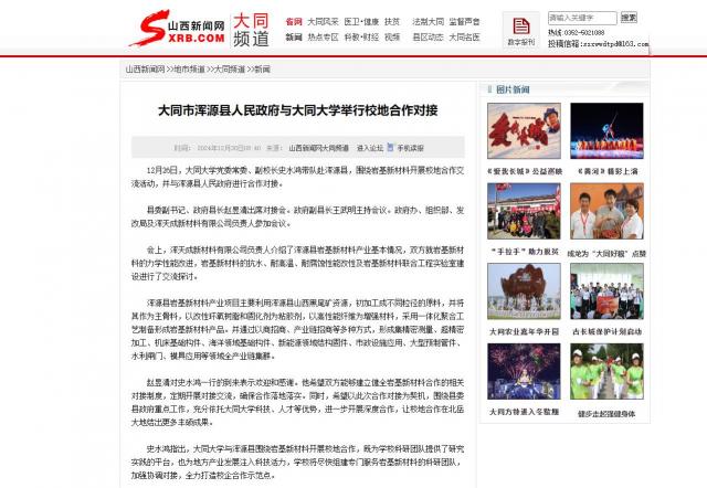 12月26日,大同大學黨委常委、副校長史水鴻帶隊赴渾源縣,圍繞巖基新材料開展校地合作交流活動,并與渾源縣人民政府進行合作對接。