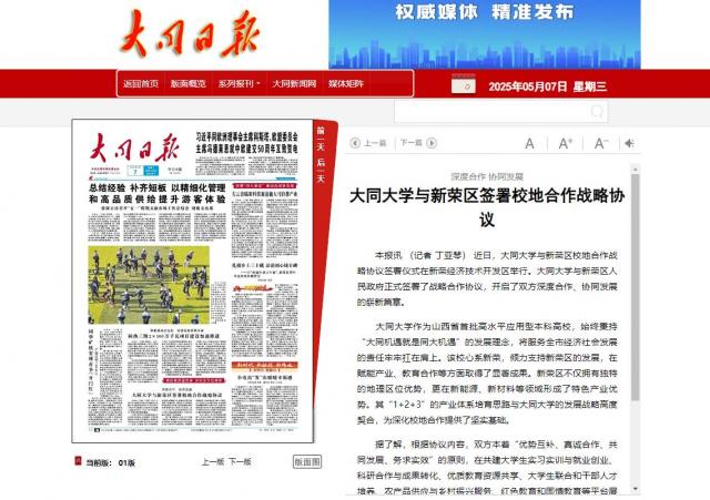本報訊(記者 丁亞琴)近日,大同大學與新榮區校地合作戰略協議簽署儀式在新榮經濟技術開發區舉行。大同大學與新榮區人民政府正式簽署了戰略合作協議,開啟了雙方深度合作、協同發展的嶄新篇章。