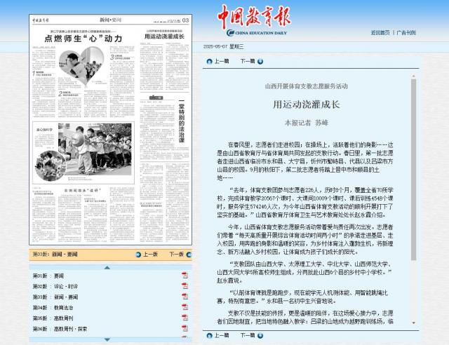 在春風里,志愿者們走進校園;在操場上,活躍著他們的身影……這是由山西省教育廳與省體育局共同發起的支教行動。春日里,第一批志愿者走進山西省臨汾市永和縣、大寧縣,忻州市繁峙縣、代縣以及呂梁市方山縣的校園。9月的秋陽下,第二批志愿者將踏上晉中市和順縣的土地……