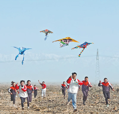志愿者服務隊隊員帶著學生們一起放風箏。圖為謝依特小學提供 |